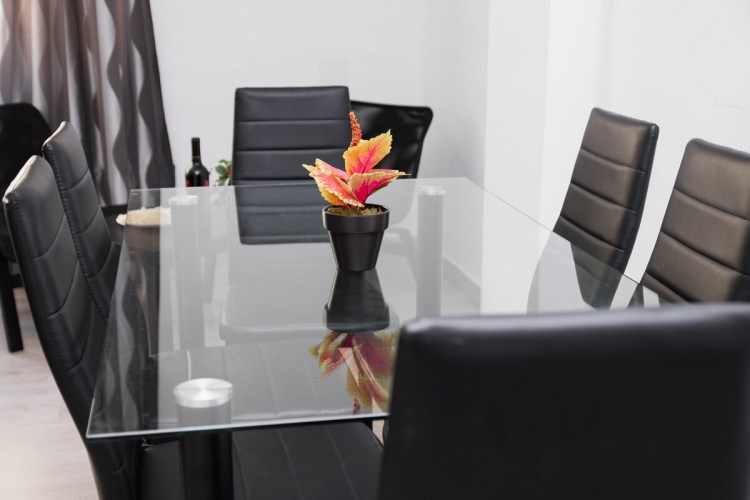 El salón incluye dos sofas (uno de ellos sofa cama), mesa comedor con seis sillas, dos sillones, dos mesitas auxiliares, estantería con televisor incluido y elementos de decoración.
